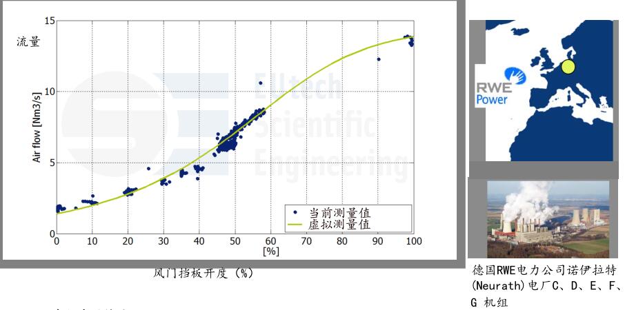 “風(fēng)量虛擬測量”已成功應用在很多個(gè)燃煤火力發(fā)電廠(chǎng)。這些虛擬傳感器有助于發(fā)現并糾正調錯的風(fēng)量。能替換有缺陷的風(fēng)量測量裝置。與手工測量(如皮托管)結果相比,具有非常接近的效果。